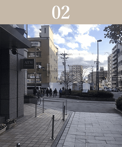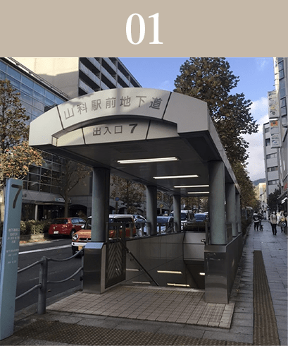 ①地下鉄東西線山科駅7番出口より出て頂きましたら山科駅を背中に外環三条へ向かってそのまま真っ直ぐ進んで頂き横断歩道にお進み下さい。