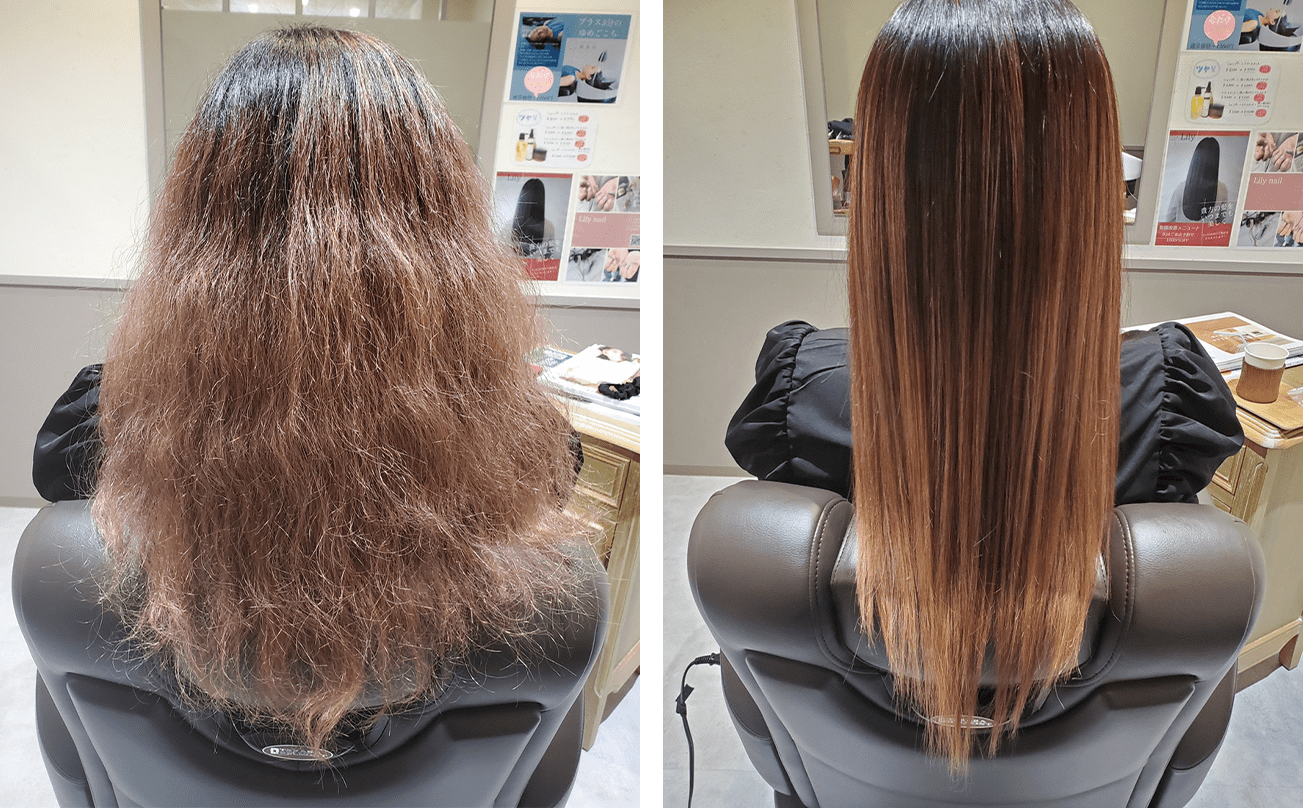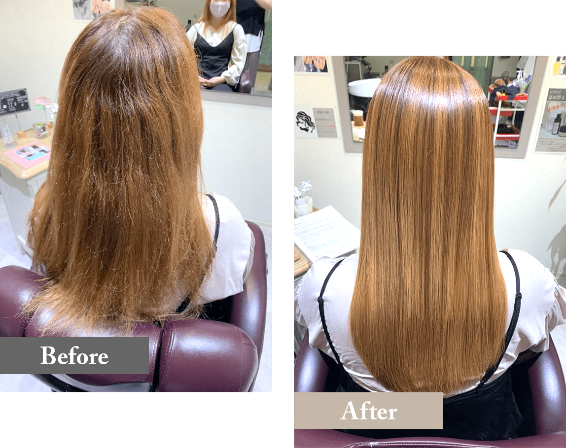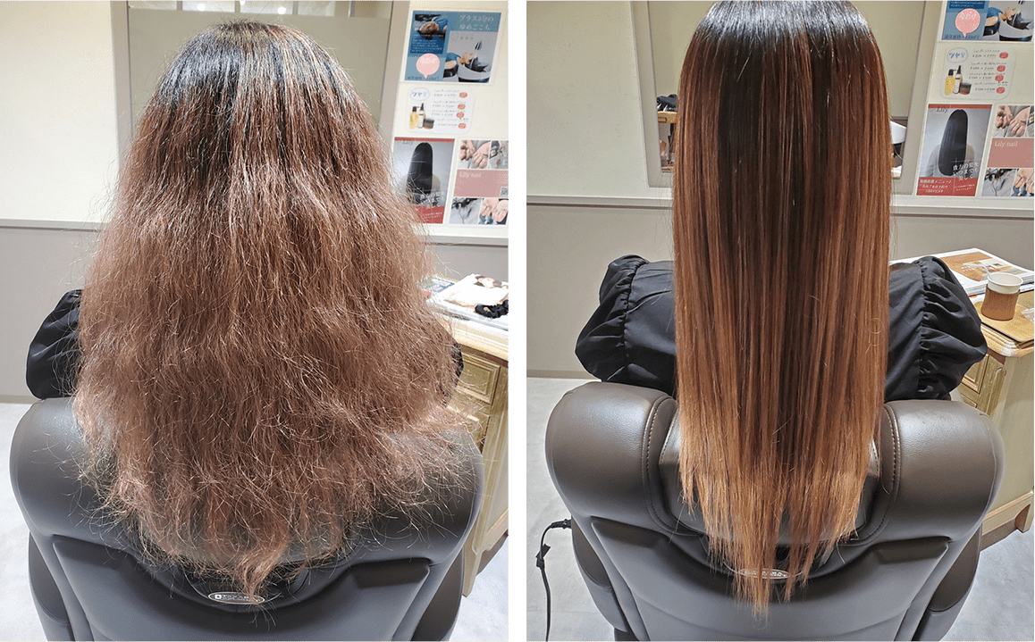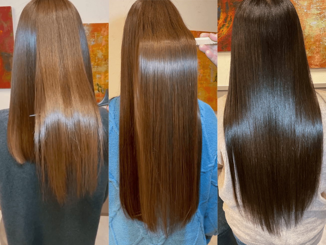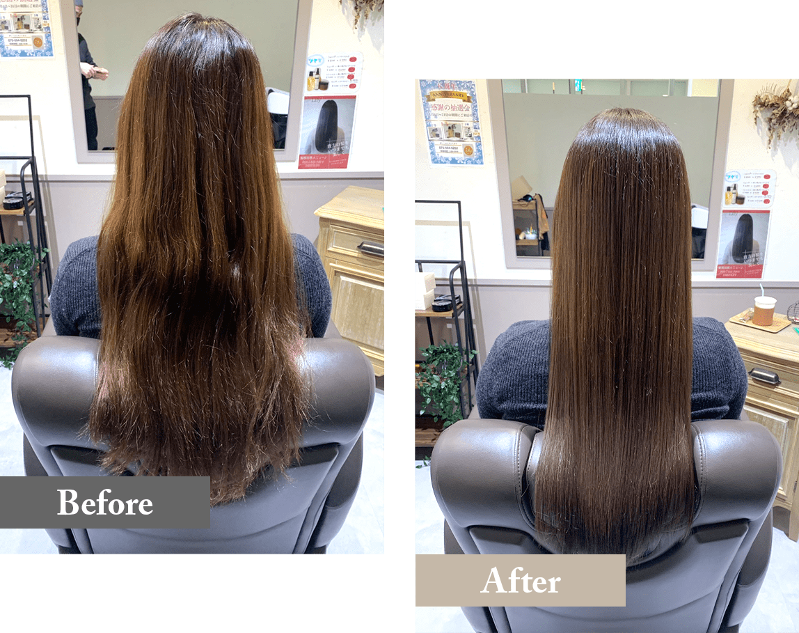髪のうねり、パサつき、絡まり、ダメージにお悩みのお客様も1回のご来店でも、髪質が変わるので、鏡越しで見る変化に感動して、次回のご予約を取られていく方も多くいらっしゃいます。そして、2回目、3回目と繰り返し施術を受けていただくことで、髪の質感もさらに上がっていき、期待以上の艶髪を保つことができます。